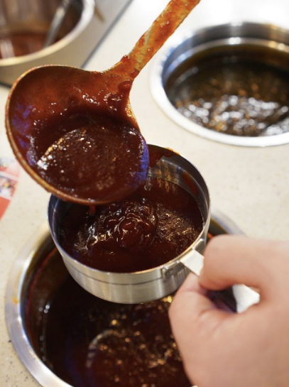 Ensuite, prenez la coupelle comme montrée sur la photo à gauche, et choisissez la ou les sauces que vous voulez pour mijoter les ingrédients, pour les sauces il y a : la sauce Barbecue, Curry (un peu épicé), Jajang, Crème, Dooki (pimenter / un peu épicé) et Ddukmo (pimenter / très épicé).