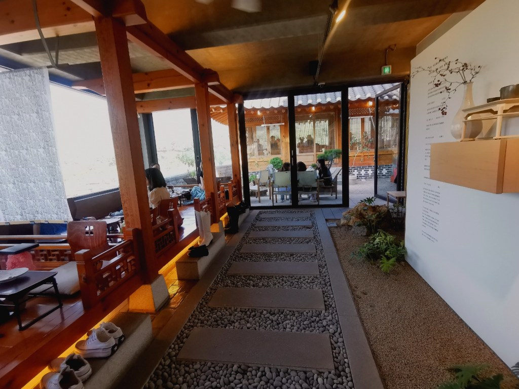 Nous avons trouvé un café magnifique, il faut le dire, la vue était à couper de souffle mais je ne vous le conseille pas. Le menu se compose que de boissons qui sont forcément servies avec des gâteaux. De plus, si vous êtes trois, vous êtes obligé de prendre un menu à 13.500 Wons, donc (10€) chacun. Notre amie a payé plus de 40 000 wons pour trois boissons et trois petits gâteaux alors qu’on avait vraiment plus faim.