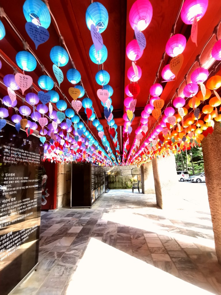 Ce temple était magnifique, des petites lanternes à l’entrée où des coréens avaient marqué leurs souhaits pendaient au-dessus de nous.