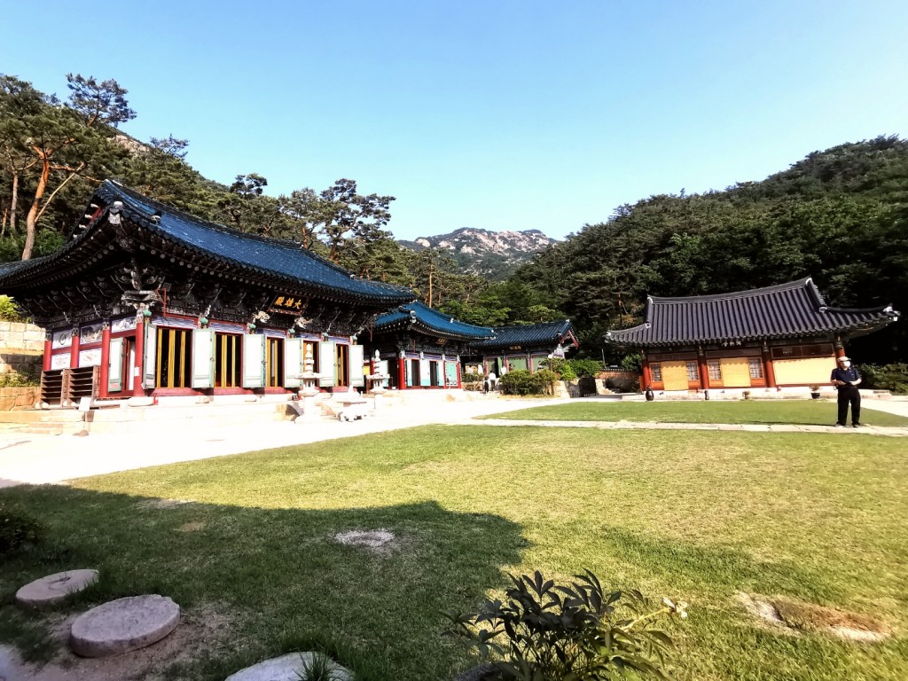 En descendant du bus, nous avons directement vu les toits des maisons à l’ancienne (hanok) comme les maisons au village bukchon à Séoul. On voyait également la montagne bien connue de Corée, Bukhansan (ps: San veut dire montagne^^).